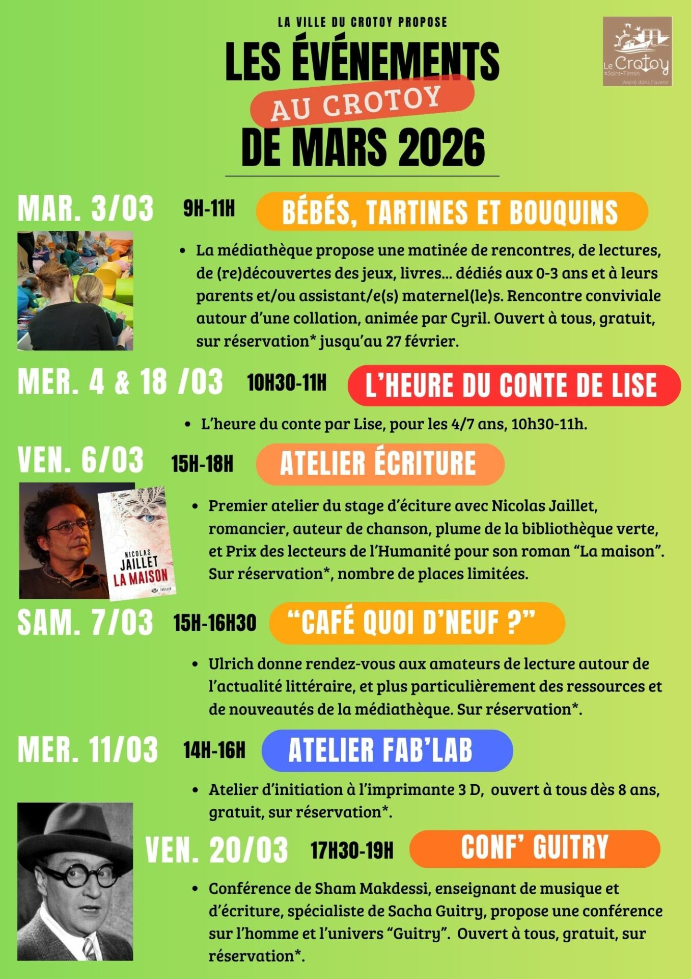 Le programme des animations de la ville du Crotoy pour Mars 2026 Rechercher Rechercher Publié le 26/02/2026 PARTAGER A LIRE AUSSI ... Attention : changement des horaires d’ouverture de déchetteries, et aussi de ramassage des encombrants Le retour des visites contées avec Arcadia jeudi 11 Août Reprise du passage des encombrants ce lundi matin Les déchetteries du Ponthieu-Marquenterre fermées ce lundi 18 septembre 2023 Distribution de raticide, mercredi 19 octobre Jour de pétanque au club de foot, samedi 23 juillet FLASH INFOS Avis aux associations, avant le 14 février 2025 Atelier ciné pour les enfants (à vos réservations!) et projection en plein air ce jeudi 15 août 2024 Le premier marché de terroir 2025, du 19 au 21 avril Ce vendredi 10 juin, première réunion de conseil municipal de retour mairie A vos réservations pour le repas dansant du 11-novembre Une délégation municipale pour dire “non” aux éoliennes en mer à Saint-Brieuc PrécédentPrécédent1er week-end de révouverture de la base nautique, samedi 21 et dimanche 22 février 2026