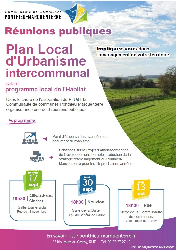 Dans le cadre de la rédaction du Plan Local d’Urbanisme Intercommunal, la Communauté de communes Ponthieu-Marquenterre organise trois réunions publiques ouvertes à tous les habitants :