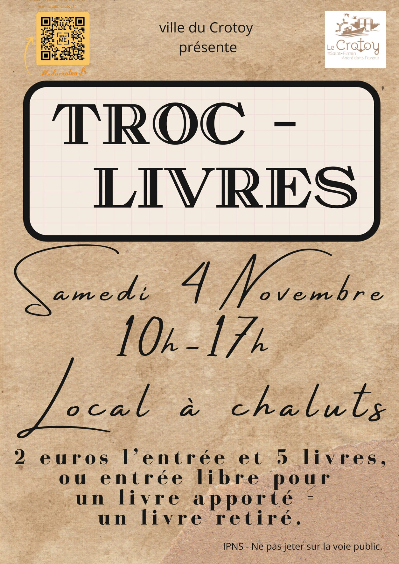 Retrouvez l’annuel troc-livre de la ville du Crotoy au local à chaluts, rue Paul Eudel ce samedi 10h-17h.