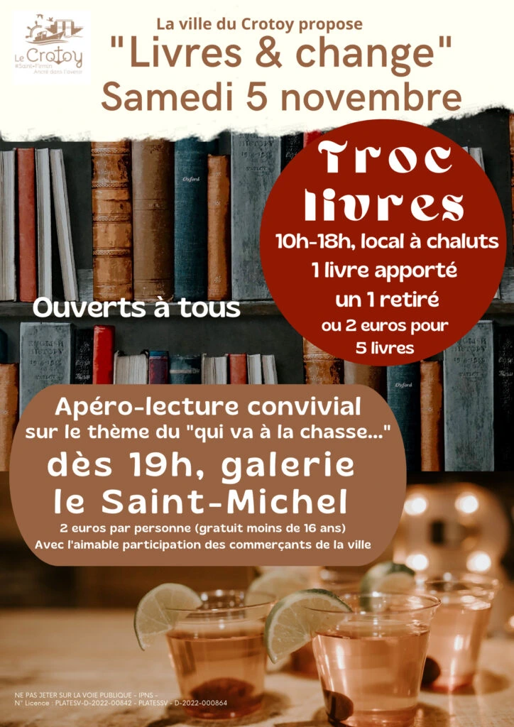 Dans la foulée de ce troc-livre, dès 19h, un apéro-lecture par nos lecteurs crotellois affamés de bons mots et de beaux textes proposeront quelques savoureuses lectures sur le thème de “Qui va à la chasse…”