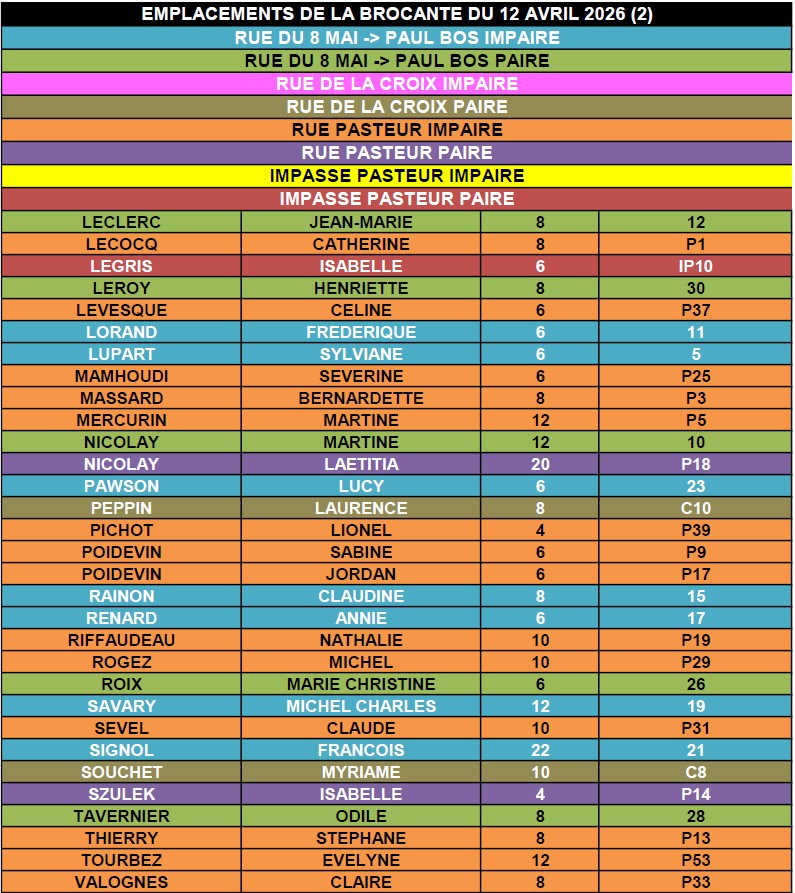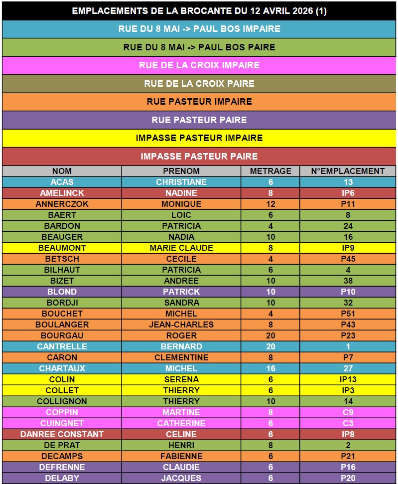Retrouvez ci-dessous le tableau des emplacements de brocante pour ce dimanche 12 avril 2026.
